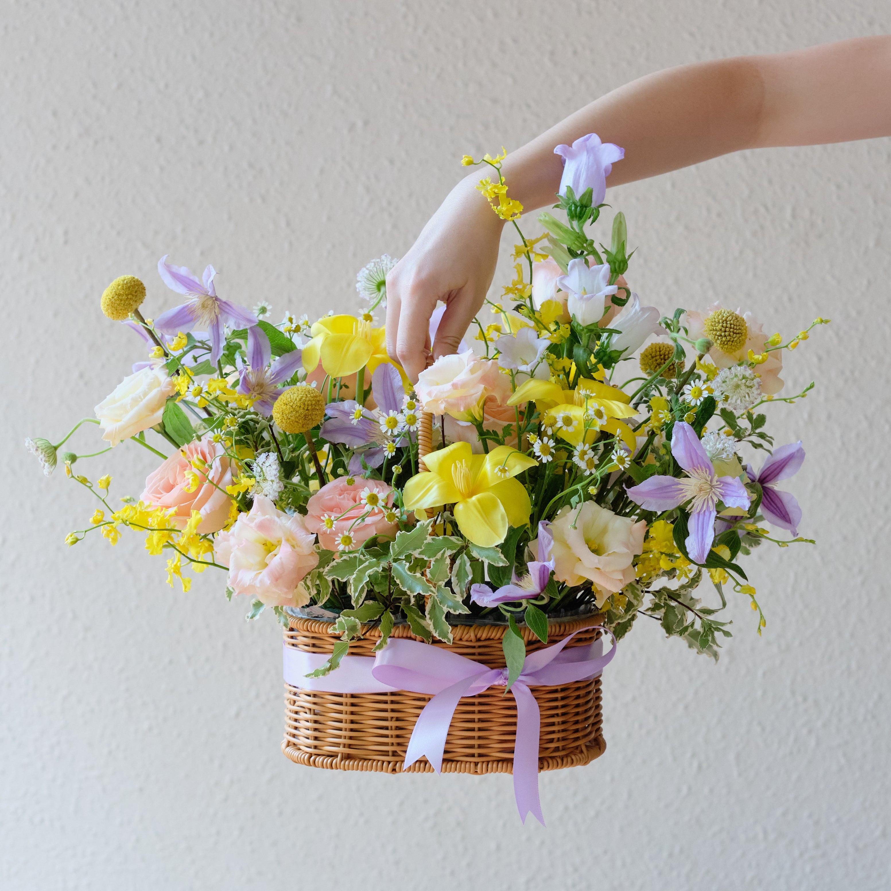 For a seasonal / premium mix of flowers, select the premium flower variety (+$50) and let our florist create a one-of-a-kind arrangement for you! Premium flowers may include: Peonies, Lilies, Ranunculus, Garden Roses, Allium, Calla Lilies, etc. Our florist will select the freshest in-season premium blooms for your basket arrangement.