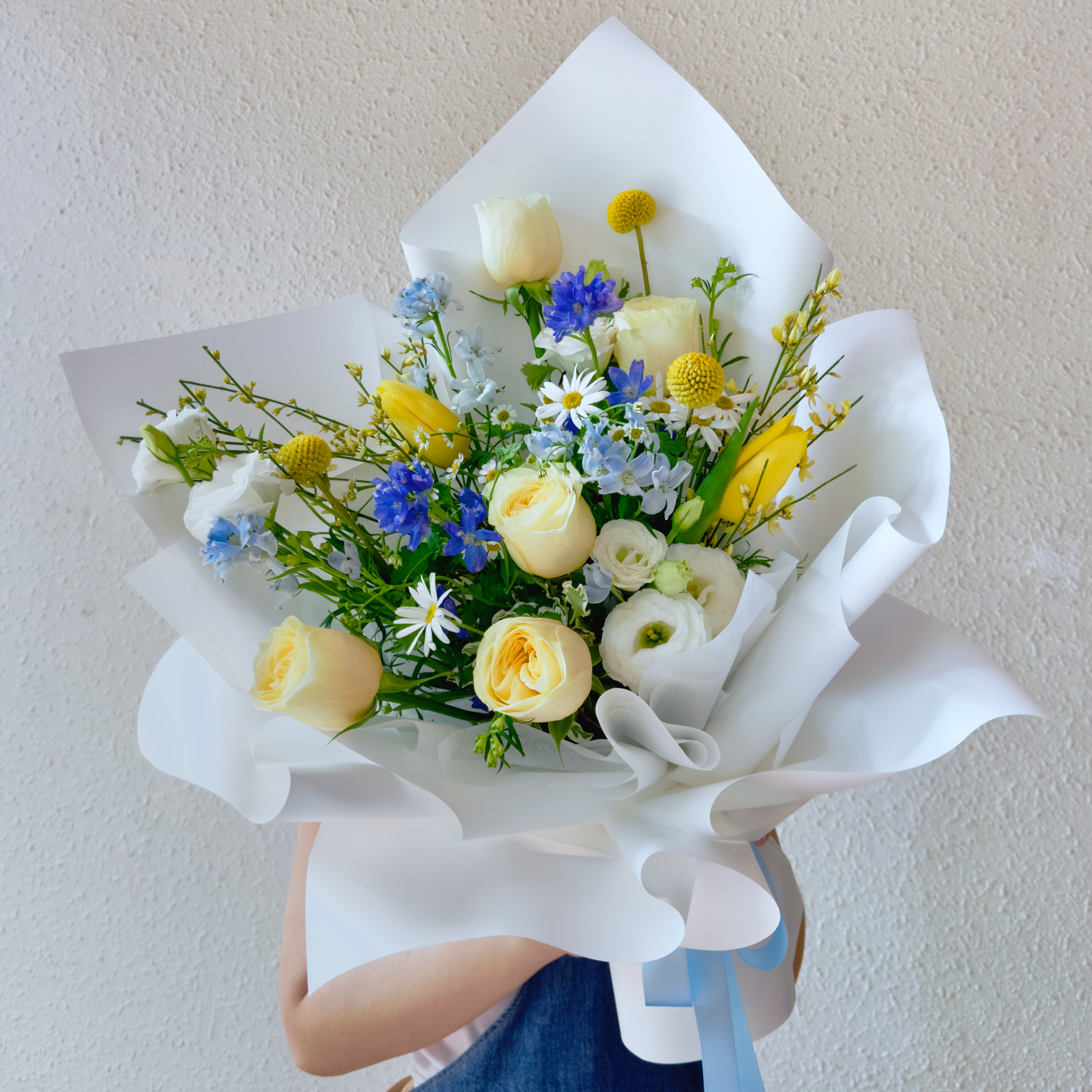 This week’s flowers include Yellow Buttercup Roses, Yellow Tulips, Yellow Billy Buttons, Blue Mini Delphiniums, Leucanthemum Daisies, Yellow Genista, White Eustoma, Mini Pittosporum.